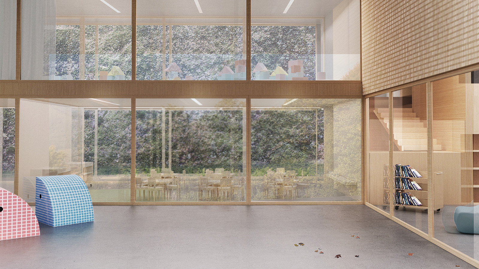 La seconda operazione progettuale è quindi costituita da un volume semplice, che ruota leggermente rispetto all’impianto della scuola elementare e si apre alla vista del contesto, seguendo l’orografia del terreno. Viene mantenuto e valorizzato il cono visivo verso valle e le nuove aule si affacciano verso la montagna, con un orientamento ottimale dal punto di vista dell’illuminazione naturale. La scuola dell’infanzia si trova a un livello inferiore rispetto alle aule e ai servizi principali di quella elementare, mantenendo separati i flussi di circolazione delle due scuole. L’accesso avviene attraverso una rampa che delimita il campo da calcio della scuola elementare. Una piazza permette all’autopostale di raggiungere l’ingresso dell’edificio e di effettuare il carico-scarico della cucina. Un nuovo sistema di rampe collega i diversi livelli della scuola elementare e allo stesso tempo separa gli spazi aperti delle due scuole. L’edificio della scuola dell’infanzia si accosta alla collina, definendone il profilo. La copertura leggermente inclinata ne segue l’andamento. Il volume è organizzato su due livelli, al piano terra l’ingresso e gli spazi per gli insegnanti, quindi lo spazio delle attività tranquille delle due sezioni, che vengono divise dal portico didattico e dai refettori. Al piano superiore si trovano invece lo spazio per le attività di movimento e per il riposo. Gli spazi interni sono in stretta relazione con il paesaggio che viene incorniciato dalle finestre. Il volume è tangente alla montagna e un leggero scostamento permette di portare luce naturale nel corridoio. La luce può filtrare all’interno anche attraverso l’uso di pannelli di calcestruzzo armato caratterizzato dalla presenza di un pattern di microelementi traslucidi.